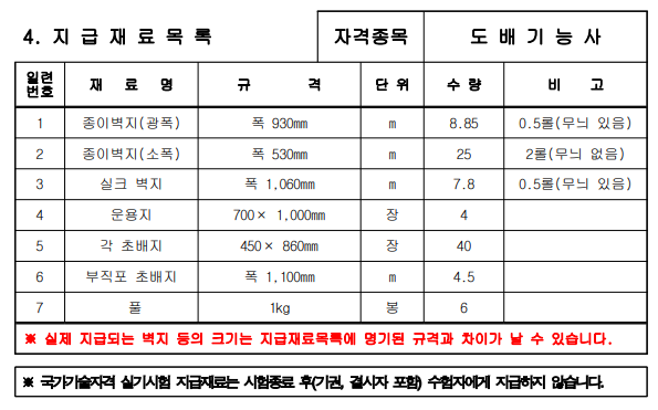 실기시험은 도면을 보고 도배작업을 직접 하는 것으로 겹침폭의 길이, 끝을 마무리 하는 방법, 풀의 농도, 벽마다 벽지를 붙이는 방법의 차이에 맞춰 그대로 벽지를 붙여야 합니다. 또한 지켜야 하는 부분이 제대로 되지 않으면 감점요인이 되며, 시험장에서 지급하는 벽지와 풀은 모두 추가로 지급하지 않기 때문에 신중히 시험을 보아야 합니다.
